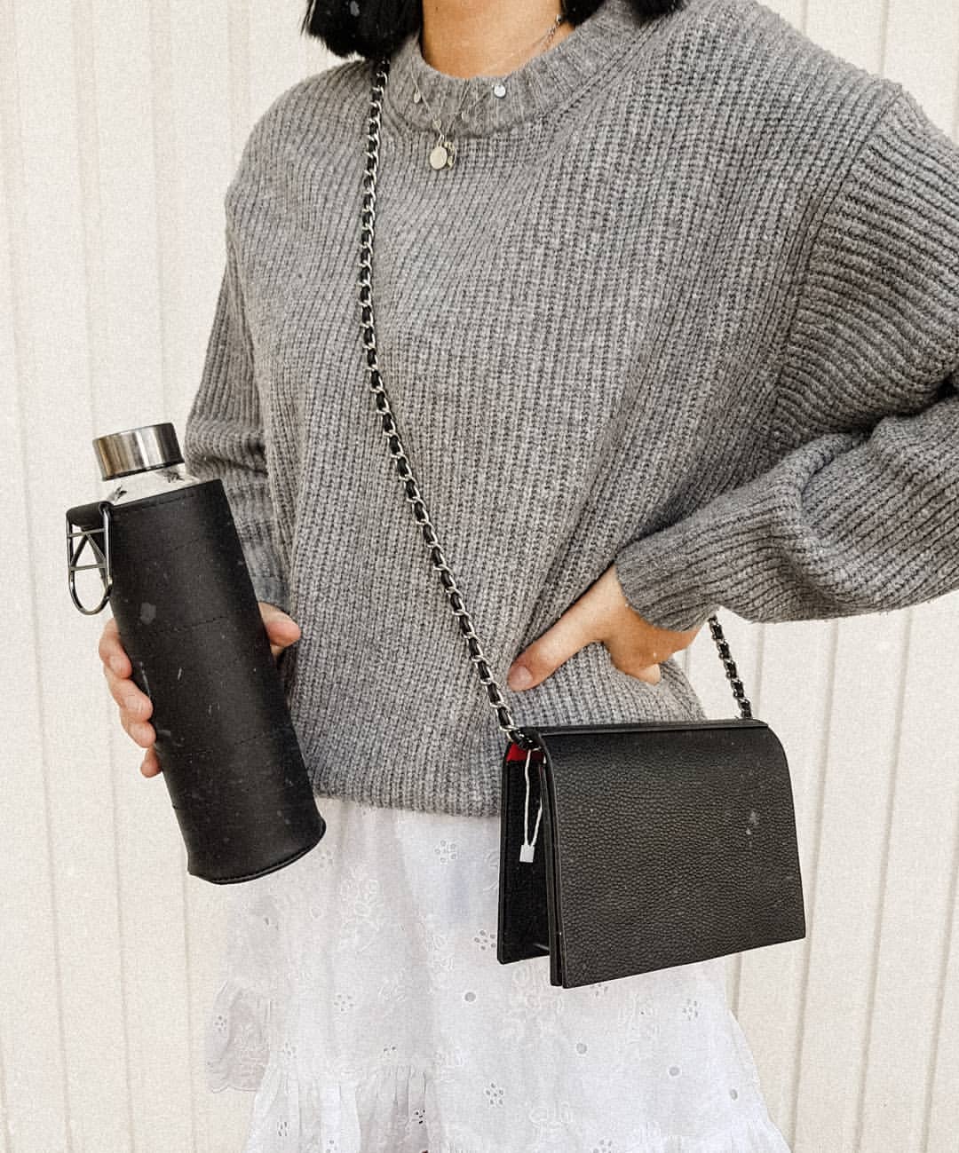 A premium glass bottle designed for sustainable, stylish hydration. Finished with a shiny black cap and paired with a black faux leather sleeve for extra protection.
